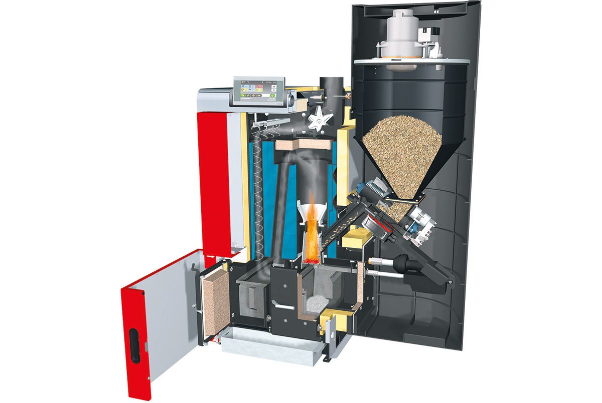 Vollautomatischer Wärmeerzeuger Co² neutraler Brennstoff (Holz), Im Gebäudebestand systemunabhängig und kann nahezu bei jeder bestehenden Heizungssituation ins System eingebundenen werden; Individuelle Situation für den Pelletslageraum wird mit realisiert ab 1 qm Platz. Mehr Effektivität auch durch Abgaswärmetauscher.